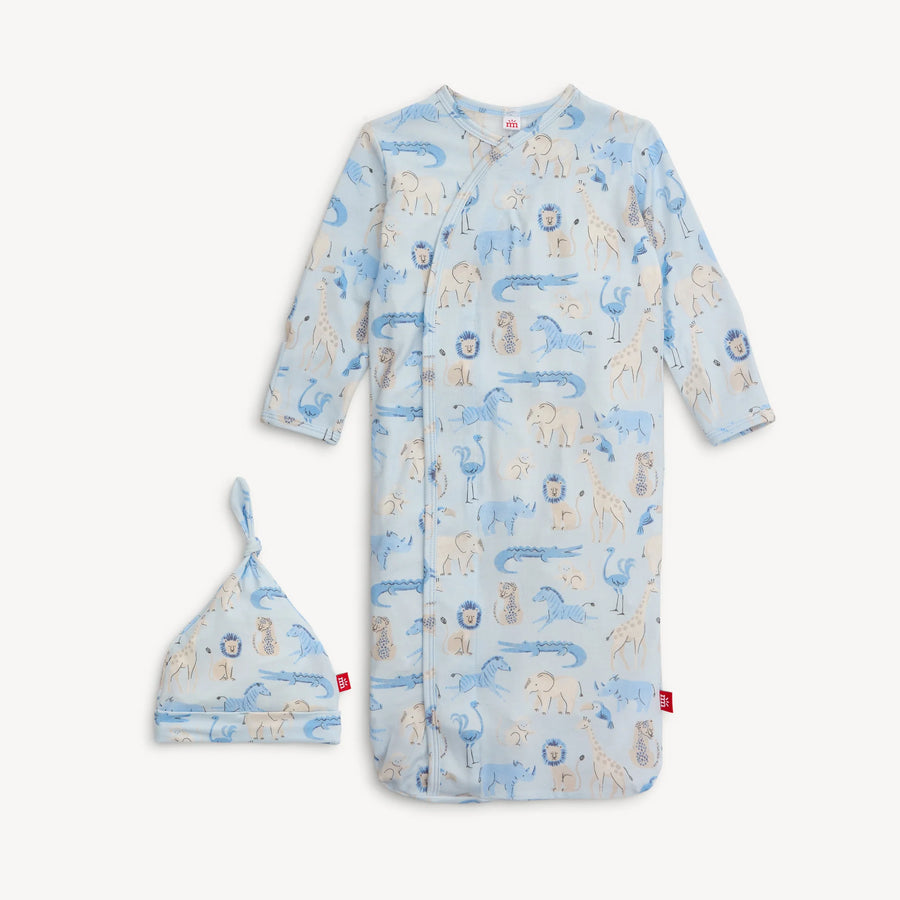 The cozy sleeper gown + hat set is a wardrobe staple for newborns who require constant diaper changes (aka all of them). with magnets down the front, baby stays in the gown during the diaper switcheroo: separate magnets, put on a freshy, click magnets, done. other amazing features: eco-friendly TENCEL™ modal fabric and built-in mitten cuffs.