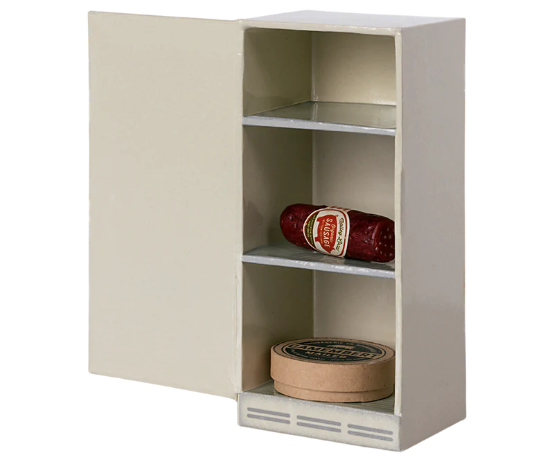 The perfect place to store your groceries so they stay fresh and cold. Inside the cooler, you find a small sausage and cheese. The cooler is made of cardboard and fits perfectly into the mouse castle.
