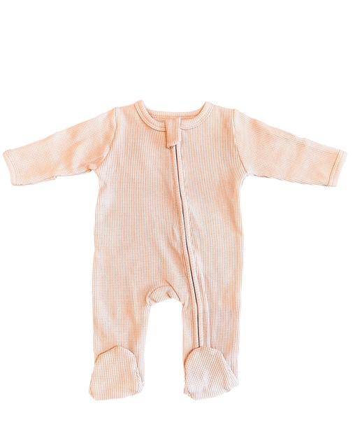 Our 100% Organic Cotton Waffle 2-Way Zip Footie in White features a soft two-way zipper with a covered interior and exterior, plus a neck protector to prevent irritation. The tagless design has size info stamped onto the fabric for added comfort. Made with Oeko-Tex-certified, azo-free dyes, this breathable footie includes fold-over mittens for scratch prevention, making it ideal for daytime wear.