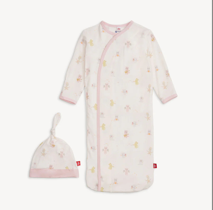 The cozy sleeper gown + hat set is a wardrobe staple for newborns who require constant diaper changes (aka all of them). with magnets down the front, baby stays in the gown during the diaper switcheroo: separate magnets, put on a freshy, click magnets, done. other amazing features: eco-friendly TENCEL™ modal fabric and built-in mitten cuffs.